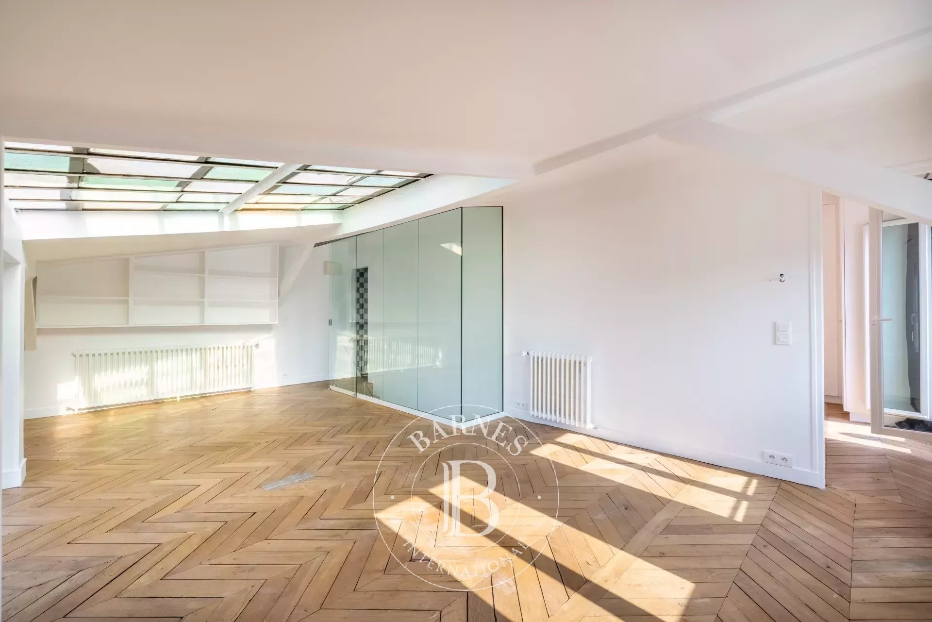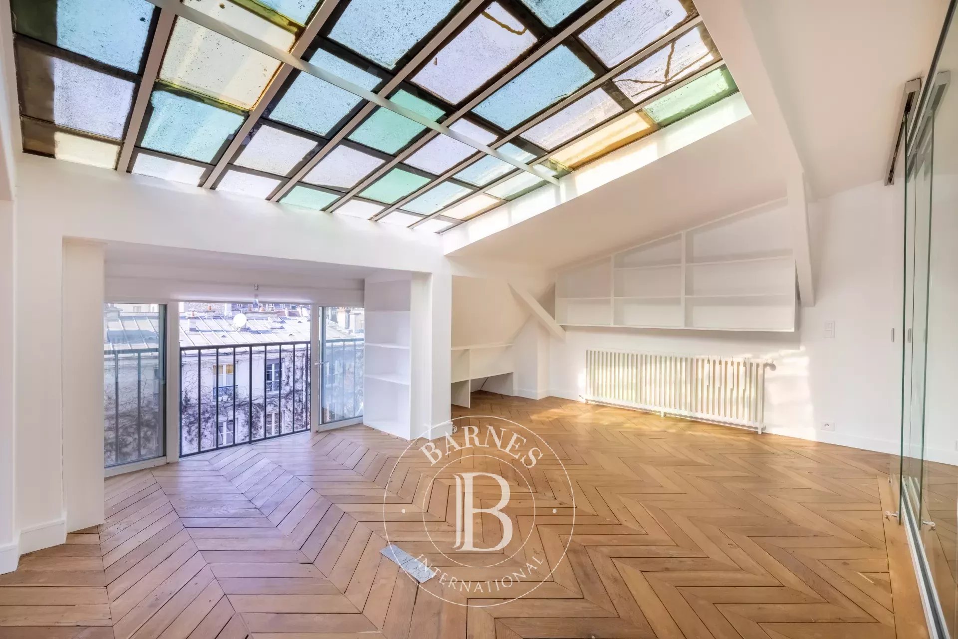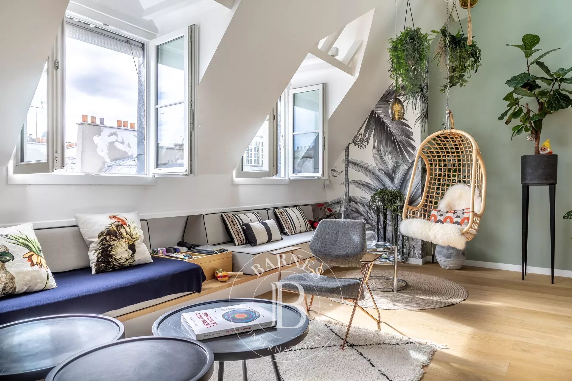 Upstairs is a second lounge with a glass ceiling, a third bedroom with a bathroom and toilet, completed by a 25m² (269 sq ft) south-facing terrace offering a 360° view over the roofs and monuments of Paris. The terrace's fittings were designed by the Artisan Fleuriste.